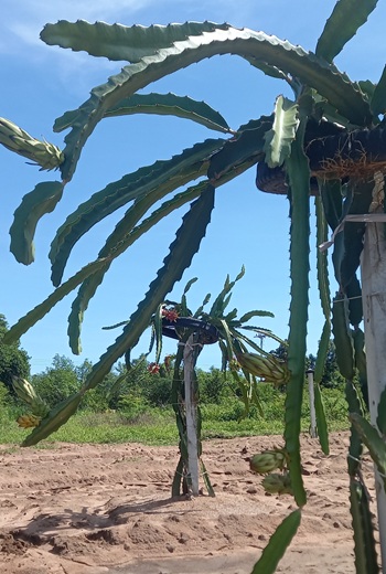 เราปลูกแก้วมังกรแดงเป็นไม้ผลหลัก ออกดอกออกผล ให้กินและขายในเดือนกรกฏาคมถึงกันยายน ปีที่แล้ว (2567) ได้บ้างแล้ว นอกจากนี้ก็มีมะม่วงอกร่องและมะม่วงมันขุนศรี กำลังเริ่มๆ ออกดอกออกผลให้กิน ส่วนมะพร้าวน้ำหอมกำลังโต คงต้องรออีก 1 -2 ปีกว่าจะออกลูกครับ